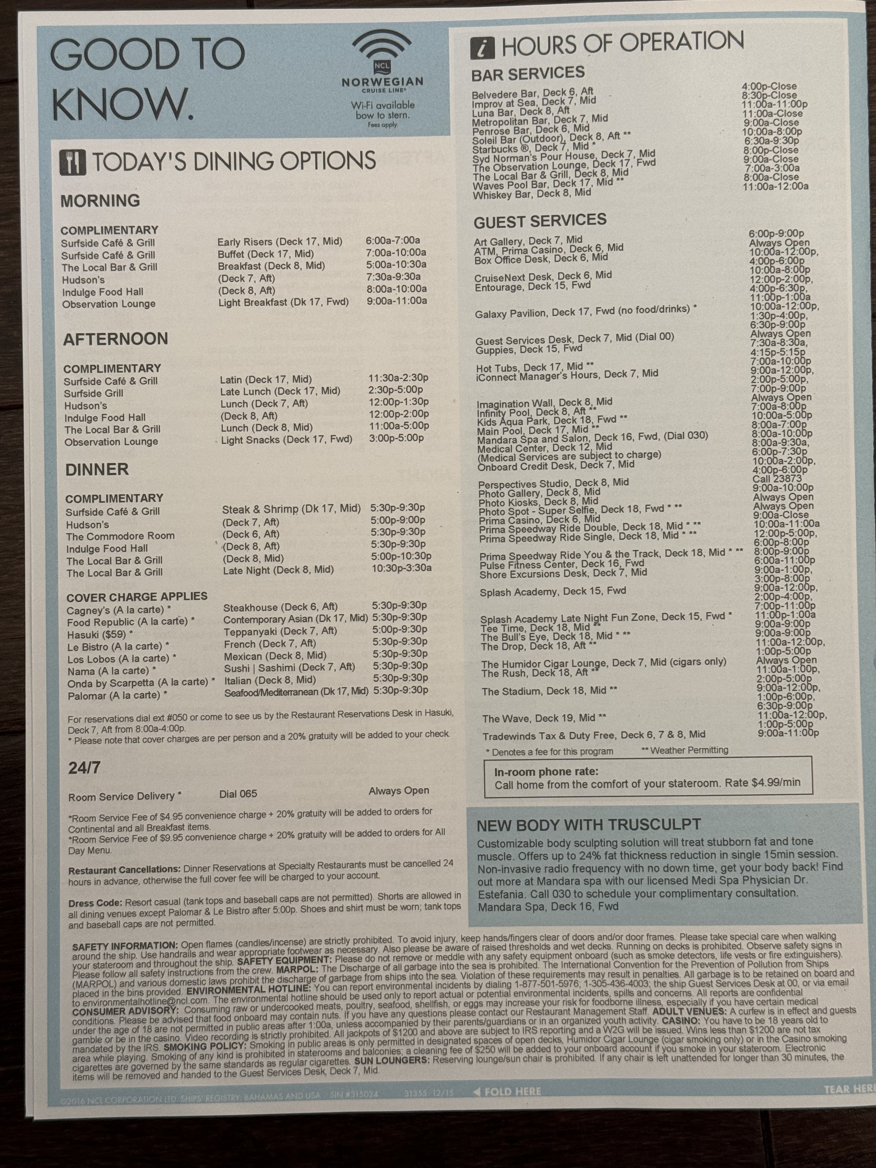 The ship's Freestyle Daily newsletters are helpful for planning out your days — your cabin attendant leave it at your door every evening, so you can use that to help map out what you want to do. I actually happened to save mine, so I just took a look: